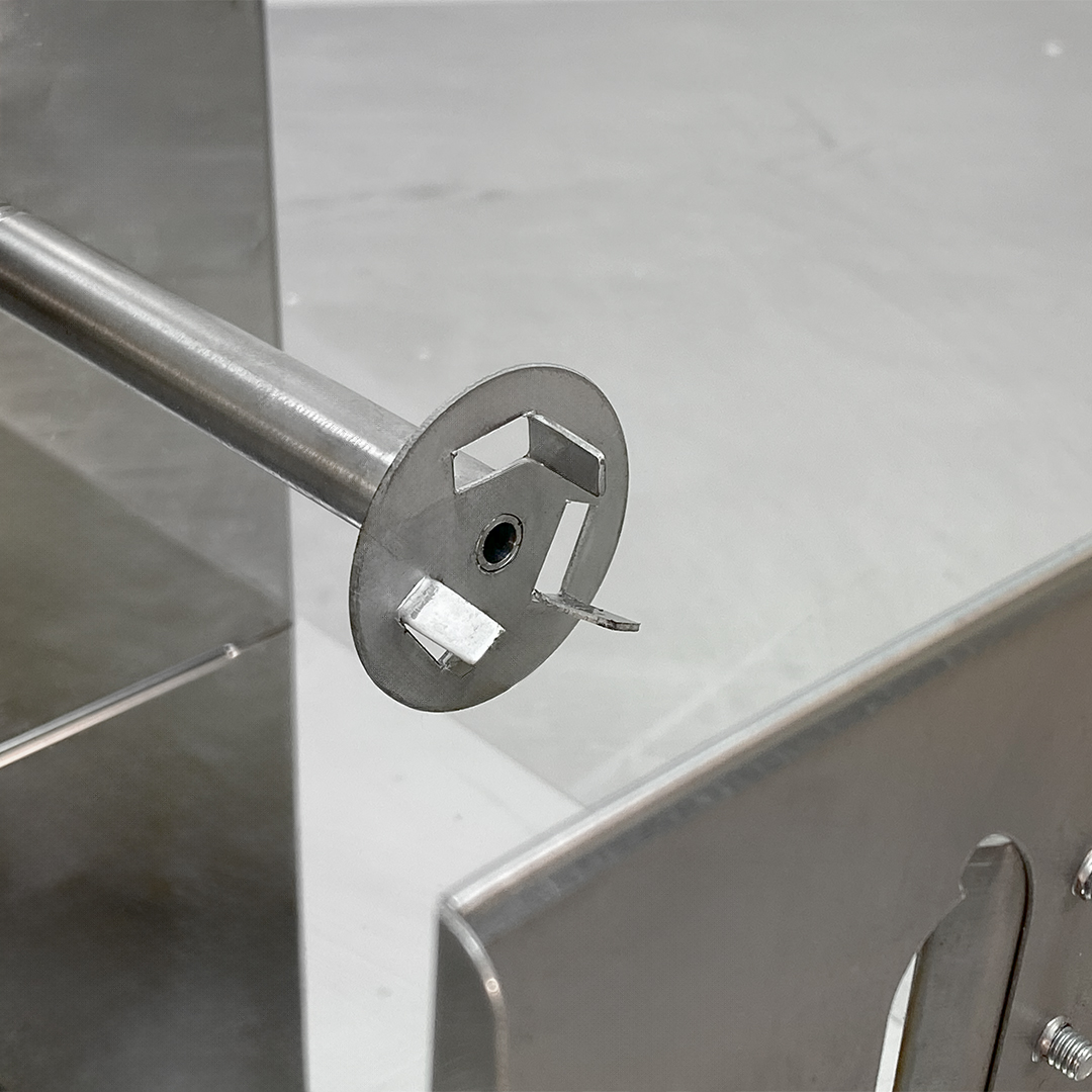 ج ) سپس سر سیخ چوبی را از تیغه ی جلوی دستگاه به بیرون قرار دهید و انتهای آن را که سیب زمینی قرار دارد را داخل چنگک انتهایی قرار دهید و آن را به خوبی چفت کنید.